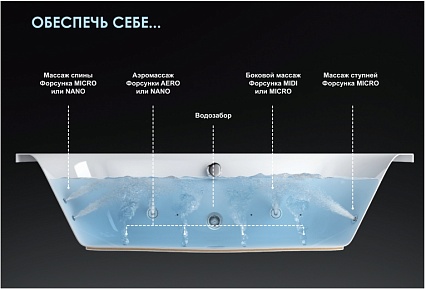Дополнительно можно приобрести: каркас, экран для ванны, слив-перелив, карниз, а также разнообразные системы гидромассажа (Relax, Soft, Nano) в цветах хром, бронза, золото.