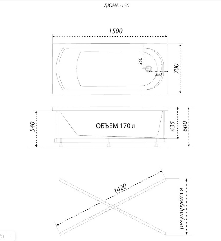 Длина, см?Длина акриловой ванны - это максимальное расстояние между точками расположенными на внешнем контуре ванны, в параллельном направлении наиболее длинной стороны для приставной ванны или просто максимальное расстояние между точками на внешнем контуре для отдельностоящей ванны.150