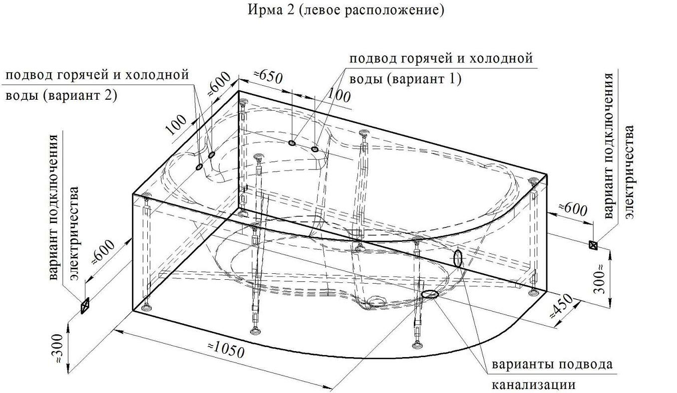 Высота, см?Высота ванны - это расстояние от пола до верхней точки ванны. Как правило у акриловых ванн установлены регулируемые ножки, что позволяет добиться устойчивого положения ванны на полу, даже в случае ели у него в разных местах существует перепад высот.64