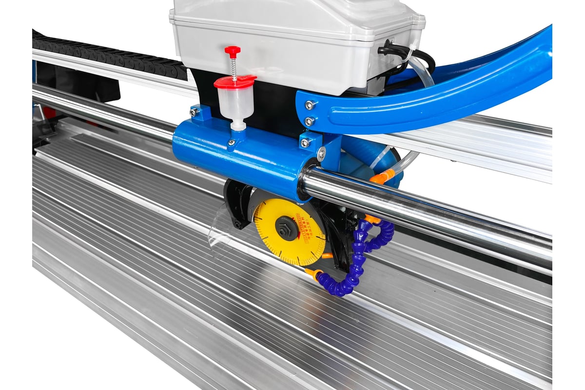 .Конструкция плиткореза выполнена в виде станка с системой перемещения каретки на подшипниках. Кроме того, имеется вертикальный ход диска и возможность настройки угла наклона до 45 градусов. Встроенная система водяного охлаждения обеспечивает защиту от перегрева и повышает производительность работы. Колесная база позволяет легко перемещать плиткорез по рабочей зоне, а лазерный указатель обеспечивает точность и удобство в работе