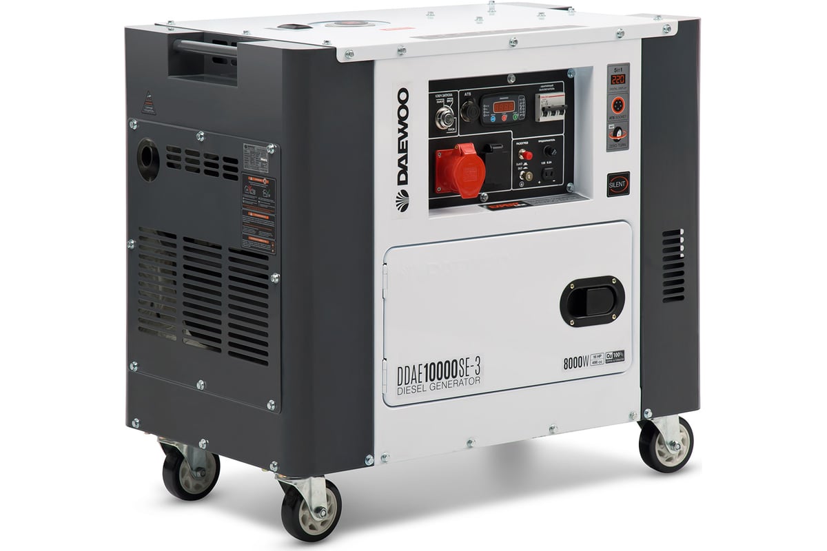 Дизельный генератор Daewoo DDAE10000SE-3 представляет собой надежный агрегат для выработки однофазного и трехфазного электрического тока. Топливный бак объемом 15 литров изготавливается из металла и имеет автоматический кран, а также снабжается системой индикации уровня топлива. Возможность предпускового прогрева двигателя позволяет использовать модель при отрицательных температурах, а также максимально снижает износ цилиндро-поршневой группы. Встроенный датчик масла дает возможность избежать масляного голодания. Вариант запуска от ключа облегчает использование генератора для неопытного пользователя и не требует прикладывания большой физической силы. Система защиты от перегрузок спасает агрегат от короткого замыкания. Наличие медного альтернатора в конструкции модели позволяет подключать инверторные сварочные аппараты. Топливный насос высокого давления гарантирует стабильность работы. Особенностью генератора является встроенная система SuperSilent, которая обеспечивает низкий уровень шума (до 66 дБ).