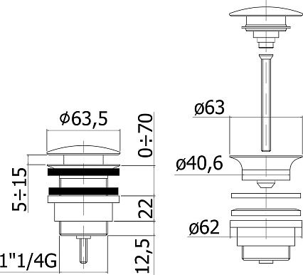 Донный клапан универсальный подходит для раковин без перелива, а также для раковин с переливом, требующих установку арматуры слива-перелива.