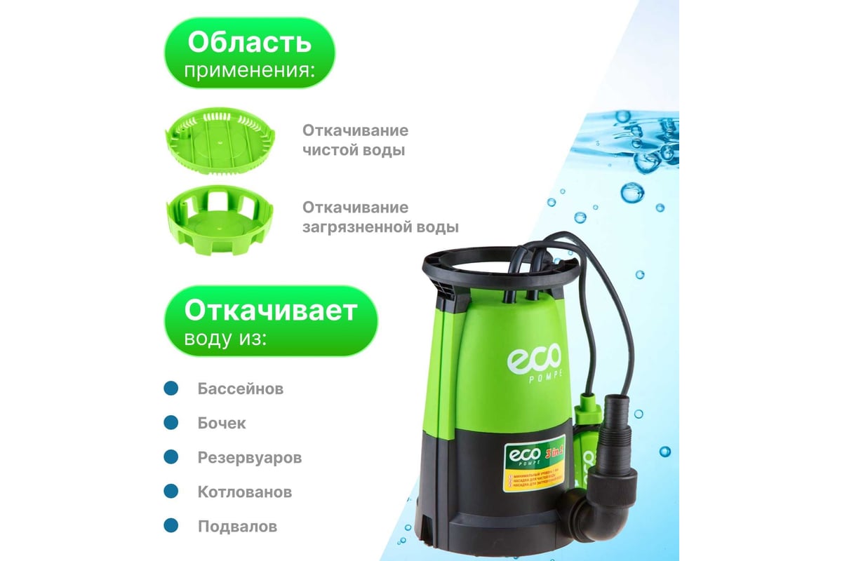 Дренажный насос ECO DP-606 применяется для перекачки чистых и загрязненных жидкостей, а также откачивания воды до минимального уровня.