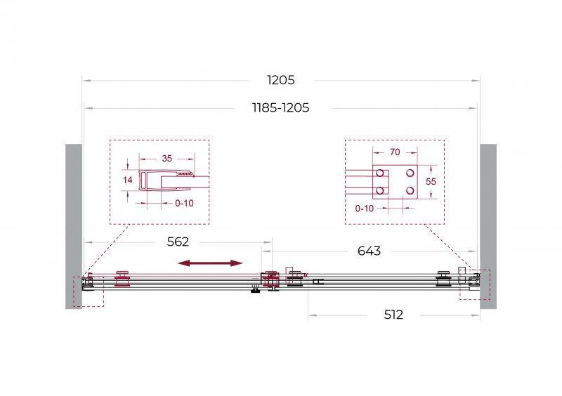 - Габариты с диапазоном регулировок, мм (1185-1205)x2000