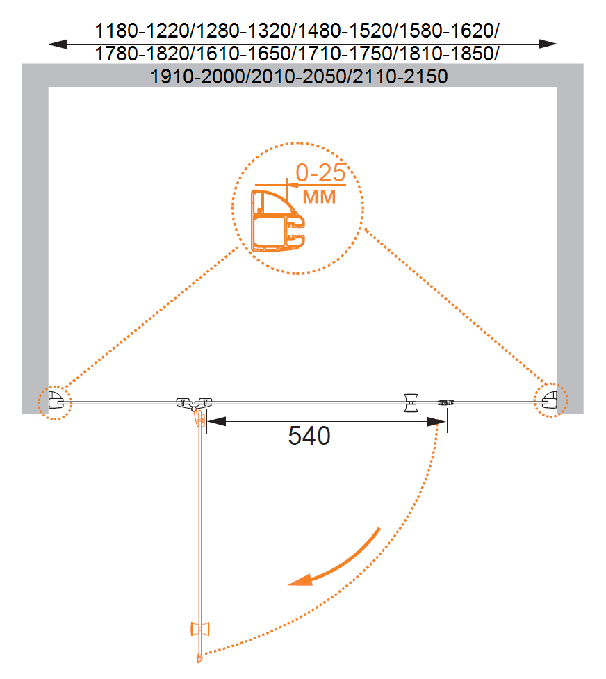 - Габариты с диапазоном регулировок (1280-1320)х1950 мм, ширина входа 550 мм