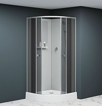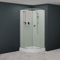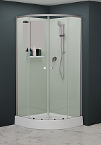 Душевая кабина закрытого типа оснащена поддоном среднего размера, смесителем, ручным душем со шлангом, штангой для ручного душа с возможностью регулировки по высоте, полочкой с бортиком, встроенным зеркалом большого размера.