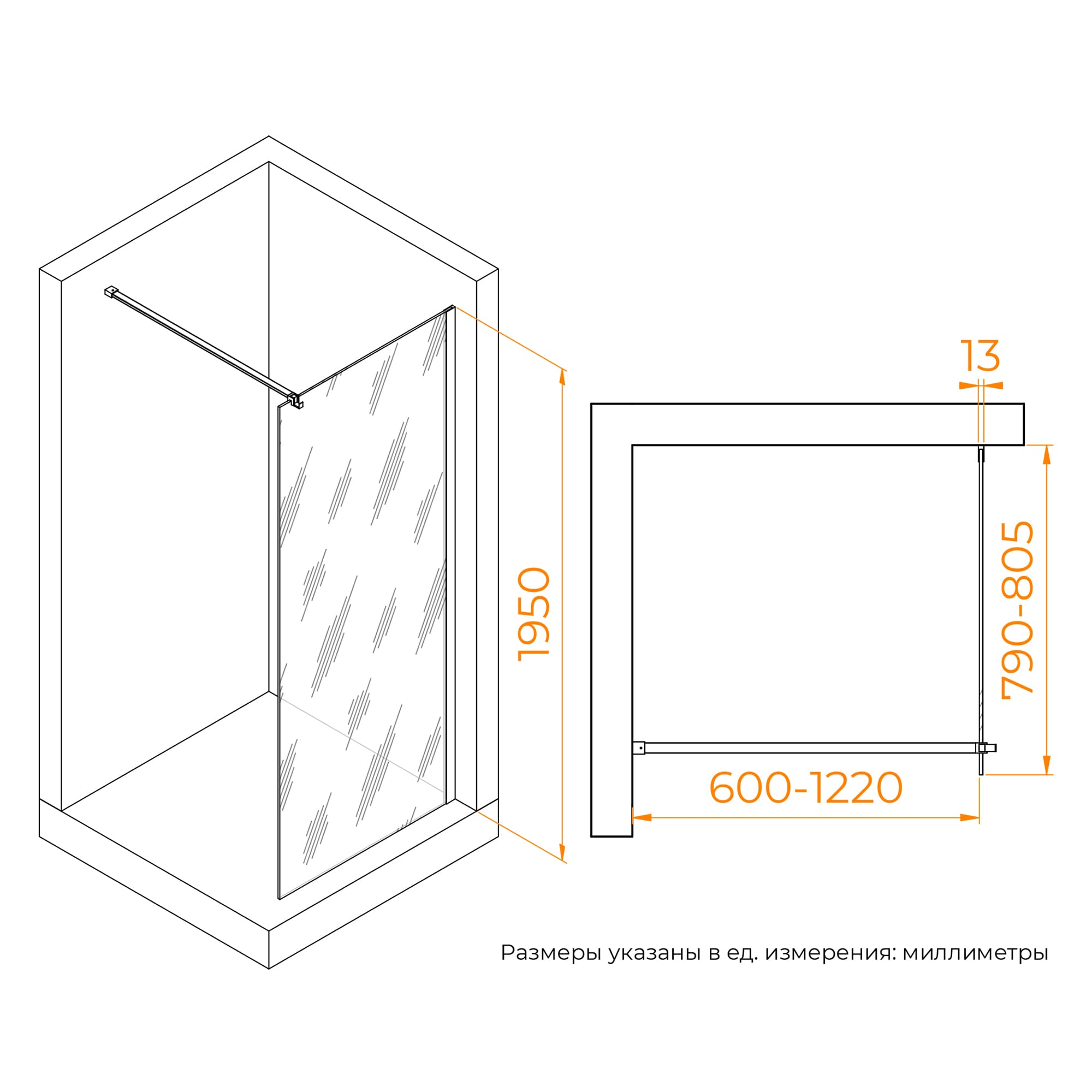 - Для стабилизации стекла перегородка крепится к стене с помощью пристенного соединительного профиля и штанги держателя длиной 1200 мм. На этапе монтажа, для изменения размера душевого пространства, штангу можно уменьшать, обрезав до необходимого размера.