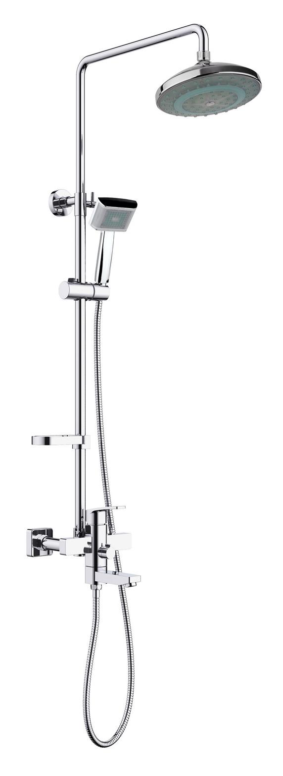 Душевая стойка Timo Beverly SX-1060/00 (3011) с подсветкой. Подсветка работает от напора воды, не требует элементов питания и подключения к сети. Включение и выключение смесителя, увеличение напора и регулировка температуры воды осуществляется поворотом ручки на корпусе смесителя. Переключение режимов подачи воды «Тропический душ», «Излив» осуществляется поворотом ручки дивертора, расположенной на корпусе смесителя. Включение режима «Ручной душ» осуществляется поворотом излива на 90° к стене.