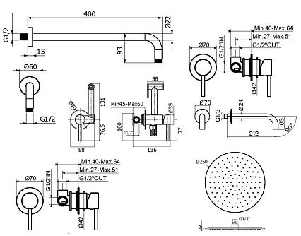- KITXO1135RS210 Комплект встраиваемого смесителя для раковины, излив 210мм, накладка диам. 70мм, внутренняя часть INT1135 в комплекте, медь брашированная IXO, SAT3130RS Настенное крепление верхнего душа 400мм из нержавеющей стали, брашированная медь, Plumberia Selection