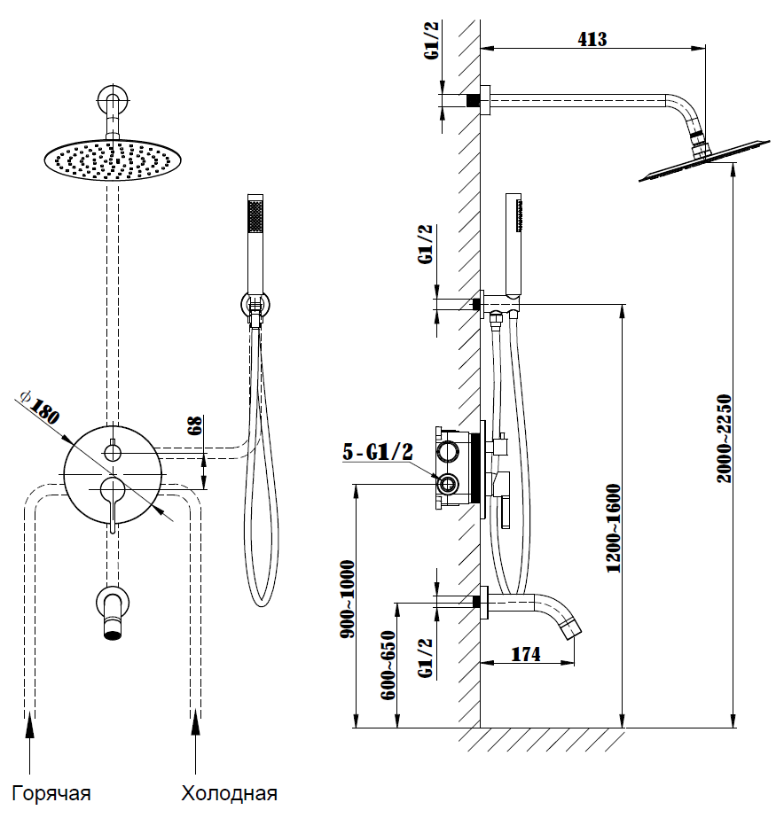 - Комплектация: Верхний душ, ручной душ, смеситель со встраиваемой частью
