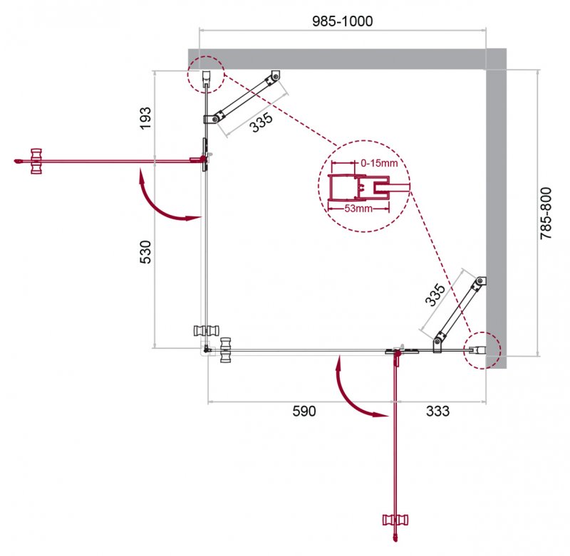 - Габариты с регулировками, мм (985-1000)x(785-800)x1950