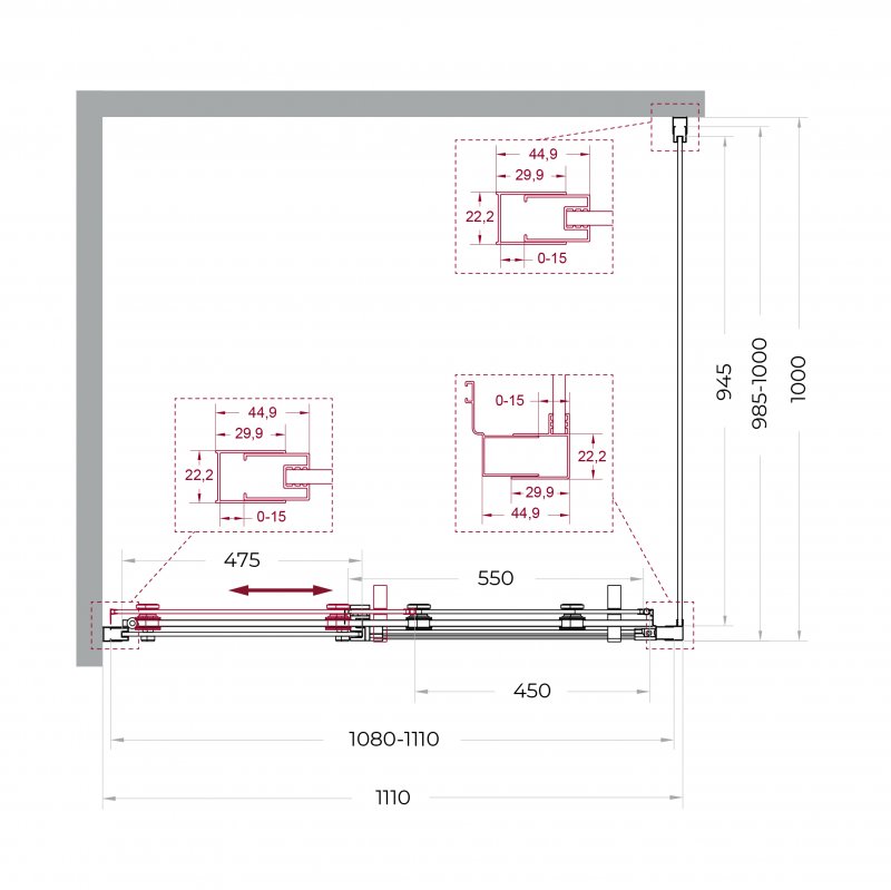 - Габариты с диапазоном регулировок, мм (1080-1110)х(985-1000)x1950