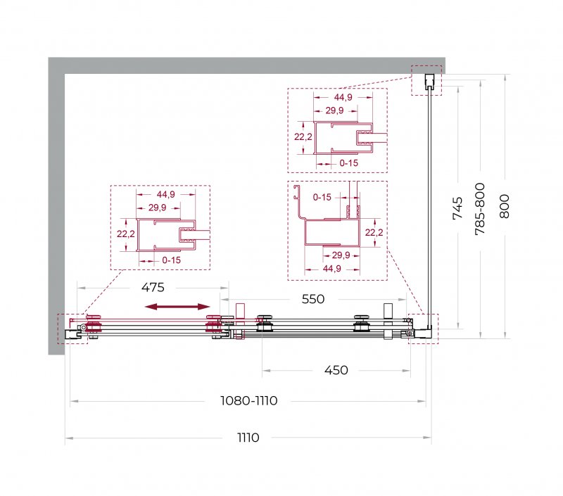 - Габариты с диапазоном регулировок, мм (1080-1110)х(785-800)x1950