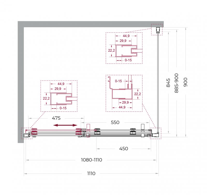 - Габариты с диапазоном регулировок, мм (1080-1110)х(885-900)x1950