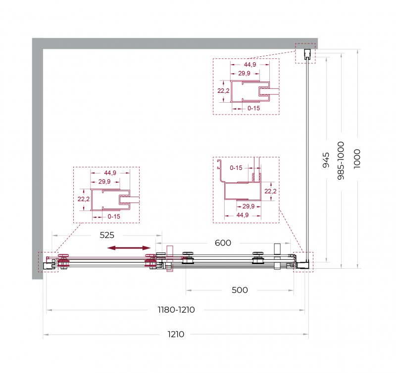 - Габариты с диапазоном регулировок, мм (1180-1210)х(985-1000)x1950
