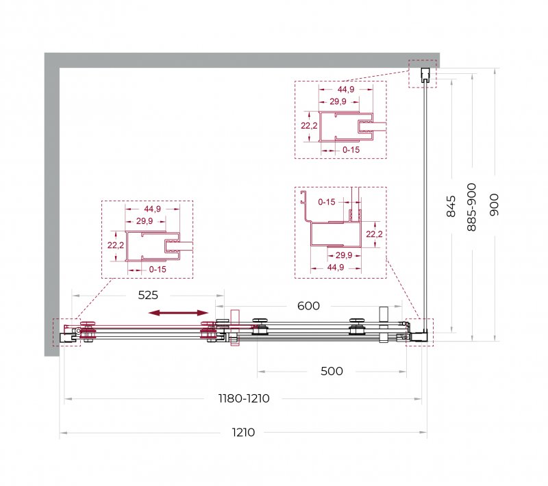 - Габариты с диапазоном регулировок, мм (1180-1210)х(885-900)x1950