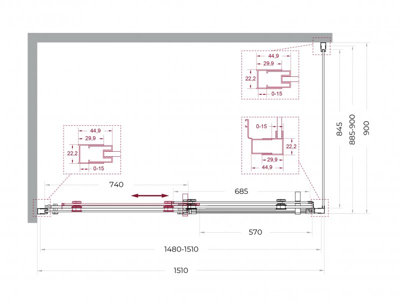 - Габариты с диапазоном регулировок, мм (1480-1510)х(885-900)x1950