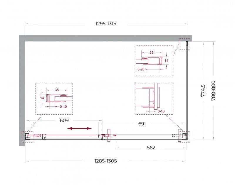 - Габариты с диапазоном регулировок (1285-1305)x(780-800)x2000 мм