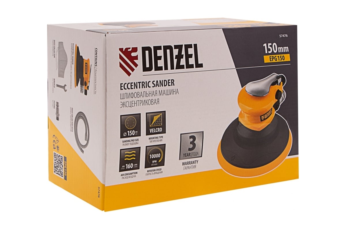 Пневматическая эксцентриковая шлифовальная машина Denzel EPG150 57476 с амплитудой 5 мм развивает скорость вращения 10000 об/мин при среднем расходе воздуха 160 л/мин. Этого достаточно для эффективного шлифования, зачистки и выравнивания любых поверхностей (древесины, металла, пластика и т.д.). С помощью машинки можно без усилий подготовить материал любой твердости к покраске или отделке, выровнять металл перед сваркой. А при использовании более мягкой насадки получится сделать любую поверхность абсолютно гладкой и придать ей дополнительный блеск.Орбитальная шлифмашина предназначена для работы при давлении 6,3 бар, расход воздуха не превышает 200 л/мин. Во время работы не забывайте использовать специальное масло ISO 46, которое можно добавлять как напрямую в инструмент, так и с помощью блока подготовки воздуха Denzel 57469, включающего в себя лубрикатор для автоматической подачи масла.