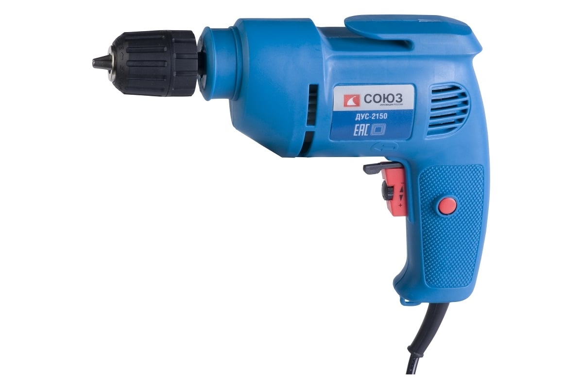 Электрическая дрель Союз ДУС-2150 применяется для работ по сверлению отверстий в дереве или стали. Благодаря быстрозажимному патрону можно быстро и безопасно заменить рабочую оснастку. На курке выключателя расположено регулировочное колесико, с помощью которого можно выставить нужную частоту вращения. Клавиша "Пуск" фиксируется в положении старт - для продолжительной работы инструментом.