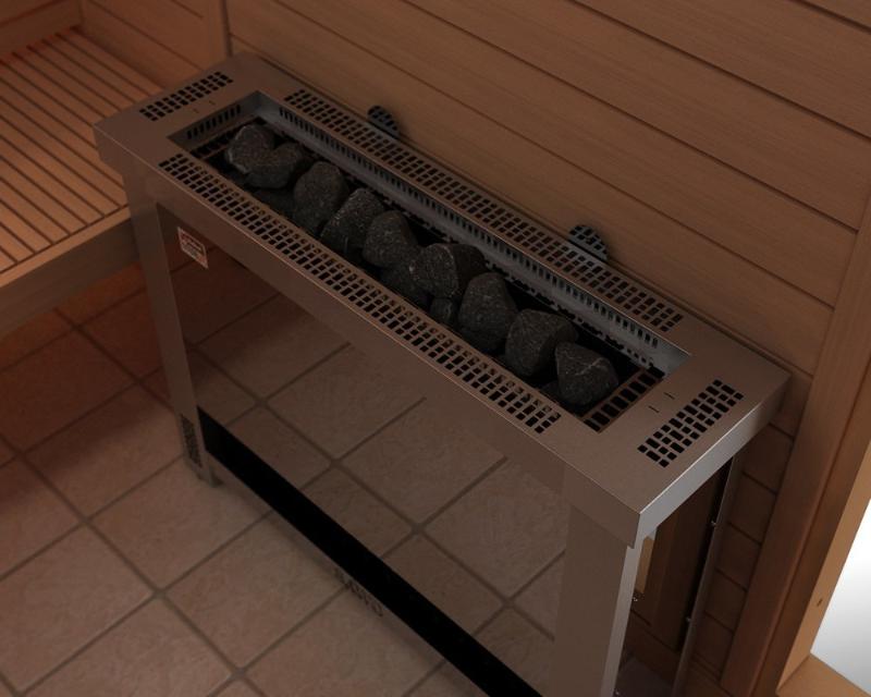 Электрокаменка SAWO HELIUS HES-60NS станет настоящей находкой для парных помещений с ограниченным пространством или особым интерьером. Это идеальный вариант для тех, кто не желает привлекать к печи особого внимания. Модель HELIUS HES-60NS удивительно тонкая и рассчитана на пристенную установку. Монтаж электрокаменки безопасен даже при расстоянии в 5 мм от стены и обрешетки. Её можно разместить даже за пологом. Финские инженеры разработали особую вентиляционную систему каменки, благодаря которой воздух в парной объёмом 5-9 метров кубических прогревается в считанные мгновенья. Печь вмещает в себя 17 кг камней. Этой массы достаточно для получения желаемого количества мелкодисперсного пара и создания в парной влажного банного микроклимата. Для изготовления печи используется высококачественная нержавеющая сталь. При условии постоянного воздействия агрессивной внешней среды материал остаётся устойчив к коррозии, обеспечивая длительный срок эксплуатации. В качестве дополнения к печи вы можете купить удобный выносной пульт с интуитивно понятным интерфейсом. Пульт размещается в предбаннике и позволяет запрограммировать режим работы электрокаменки.