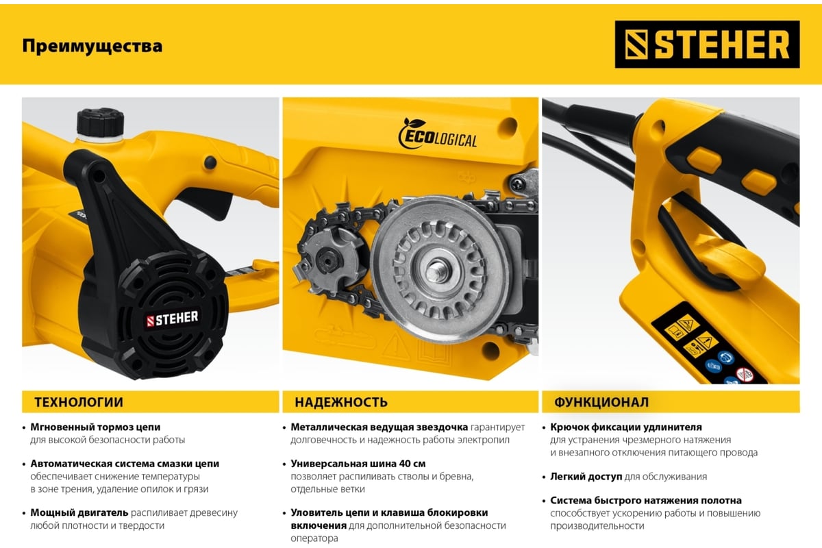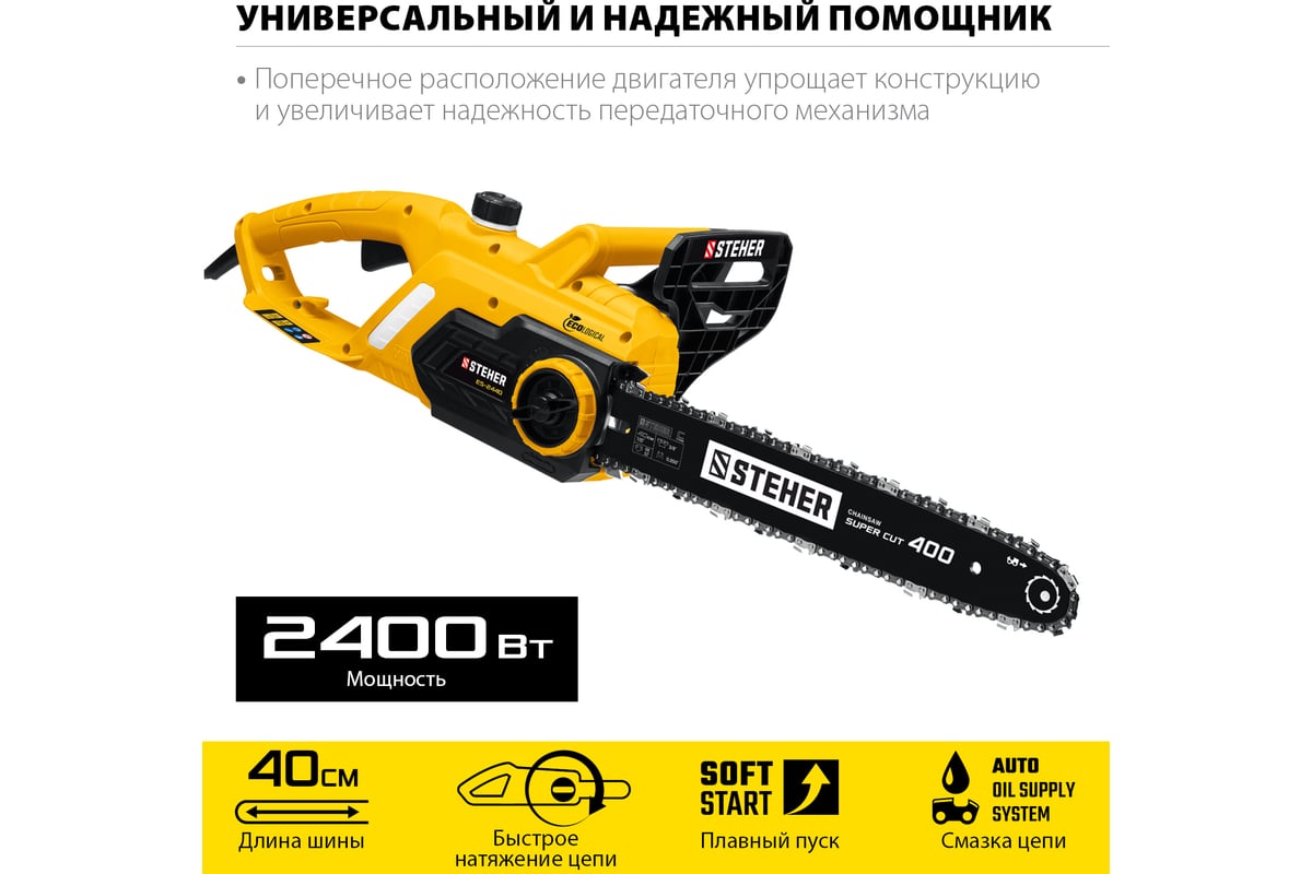 Электрическая цепная пила STEHER 2400 Вт ES-2440 применяется для валки деревьев, а так же пиления веток, обрезки сучьев, пиления деревянных балок, досок и тому подобное.