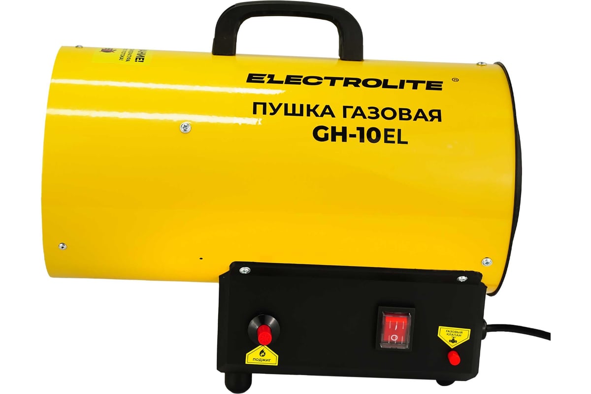 Газовая тепловая пушка Electrolite GH-10 EL (10 кВт, 350 м3, ПРОПАН/БУТАН) 2949 - пушка обогревает помещение площадью до 350 кв.м и имеет мощность 10кВт. Электролит оснащен удобной ручкой для транспортировки. Пушка имеет прямой тип нагрева, поэтому тепло распределяется равномерно. Горелка и система безопасности в комплекте делают пушку надежной и безопасной.