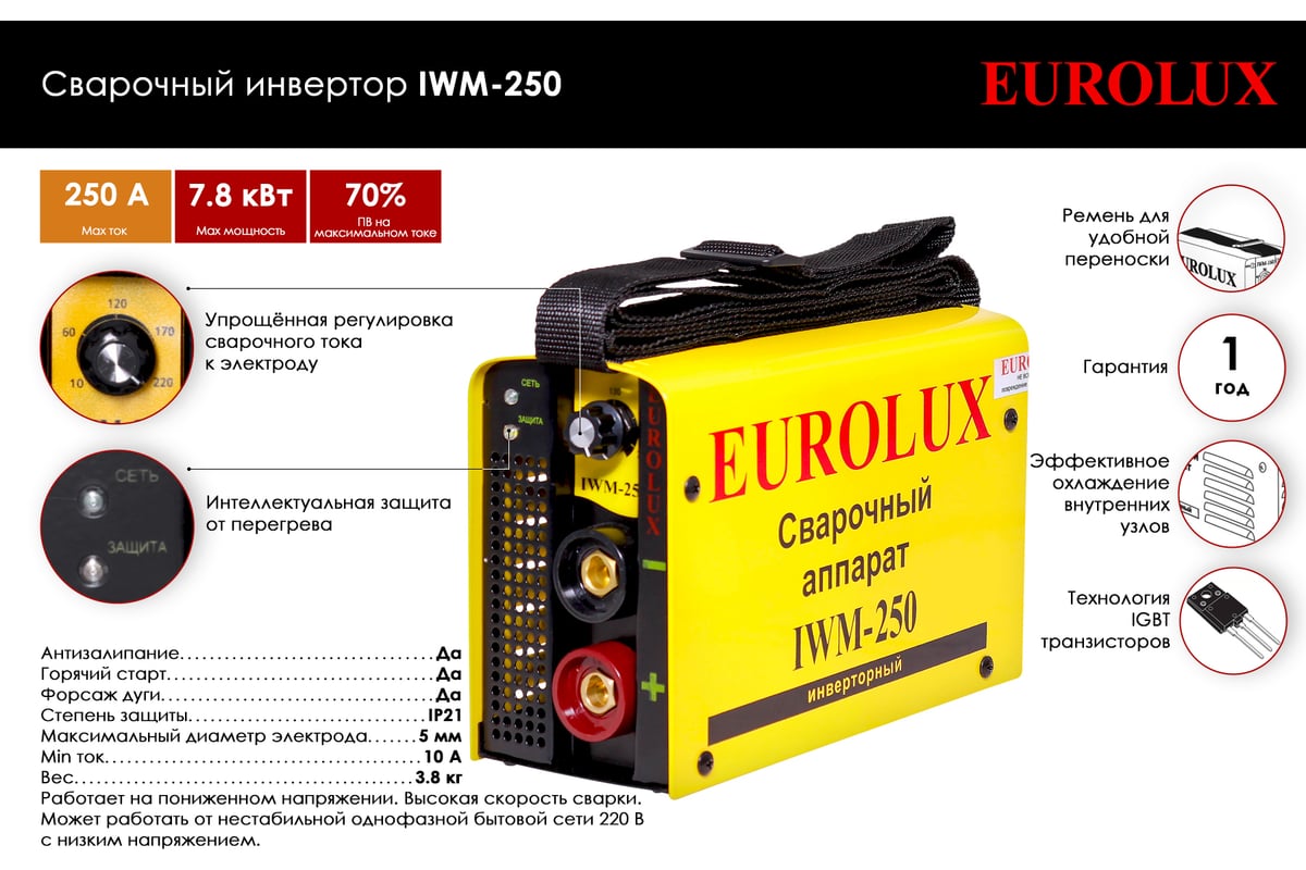 EUROLUX IWM-250 – компактная модель сварочного инверторного аппарата, с помощью которого можно выполнять ручную дуговую сварку методом ММА.