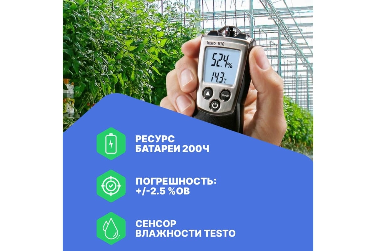 testo 610 измеряет влажность воздуха и температуру. Запатентованный сенсор влажности Testo обеспечивает надежность результатов измерений. Погрешность +/-2.5 %ОВ подтверждена протоколом калибровки, который входит в комплект поставки.