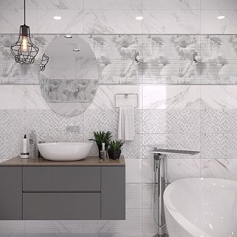 Благородный белый каррарского мрамора коллекции Celia оживляется крупными фотореалистичными лилиями настенного панно. Мягкие оттенки серого контрастирует с жестким блеском зеркального орнамента, чередование гладкого и волнистого рельефа задает внутренний ритм пространству. Продуманное сочетание фактур и цвета позволяет добиться интересных визуальных эффектов и создать необычный и ярко-индивидуальный интерьер.