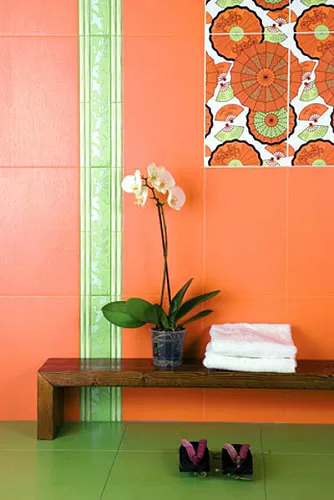 Плитка «Кимоно» входит в Японскую коллекцию. Это настенно-напольный облицовочный материал. Разработан в нескольких вариантах – в теплых и холодных тонах (рассвет/закат). Теплые расцветки содержат салатовый, оранжевый и бежевый цвета, холодные – сиреневые, серые и белые. Коллекция дополнена уникальными декоративными элементами – художественно выполненные изображения анималистической тематики (взлетающие журавли). Также имеются флористические декоры в виде ярких и крупных цветов, выведенных на отдельной плитке. Присутствуют бордюры, вставки и планки. Величина напольной плитки – 402х402 мм, настенной – 250х400 мм. Относится к средней ценовой категории.