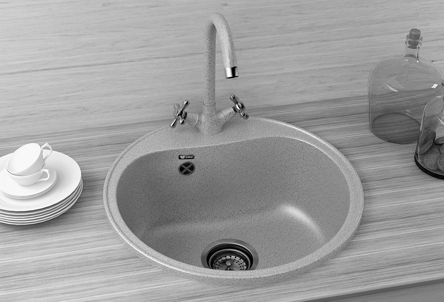 Круглая мойка из искусственного камня. Модель Ulgran U-100. С отверстием под смеситель. Выпуклый бортик по периметру окружности не позволит скатываться каплям воды за пределы мойки.