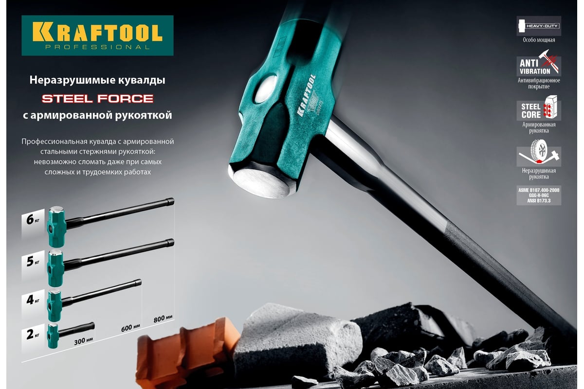 Кувалда KRAFTOOL 2009-2, предназначена для слесарно-монтажных работ. Рукоятка армирована стальными стержнями. Кованая инструментальная сталь. Закалено токами высокой частоты.