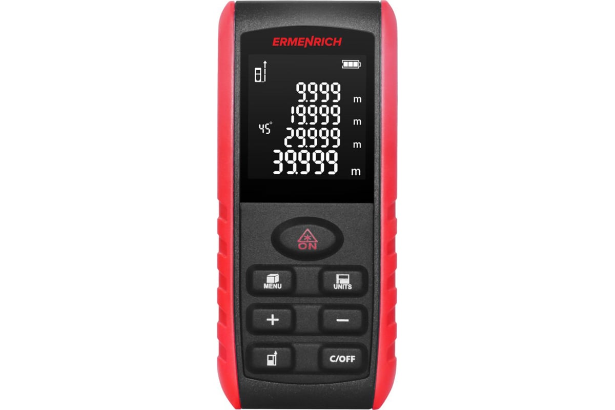 Лазерная рулетка Ermenrich Reel GE60 позволяет делать точные измерения длины в диапазоне от 0,05 до 60 метров, а также измерять углы, площадь и объем помещений и объектов. Важным достоинством прибора является функция «Пифагор»: если нет возможности установить рулетку в нужной точке или на пути лазерного луча возникает препятствие, достаточно сделать два дополнительных измерения, по которым рулетка рассчитает нужное расстояние. Дисплей отображает 4 строки с показаниями, а память сохраняет до 99 групп результатов. Показания даются в метрической (метры) или английской (дюймы, футы) системе мер. Работает рулетка от батареек типа ААА, заряда которых хватает на 5000 измерений. Для экономии энергии присутствует функция автоотключения.