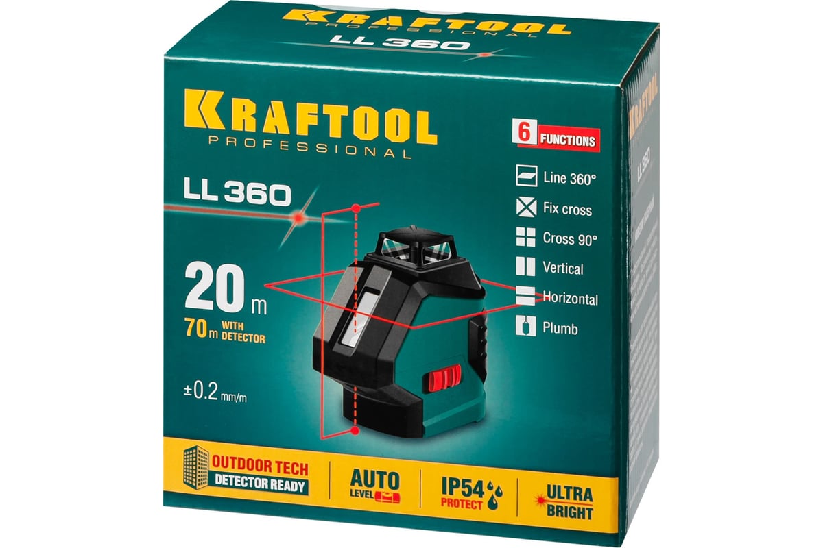 Лазерный нивелир KRAFTOOL LL360 34645 предназначен для эксплуатации внутри помещений и на улице. Имеет три рабочих режима: автоматическое выравнивание, построение наклонных линий и работа с детектором. Проецирует горизонтальную линию на 360 градусов, вертикальную линию, а также отвесы вниз и вверх.