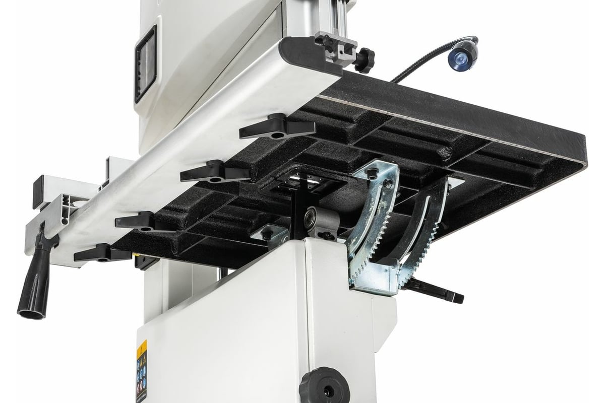 .Двухскоростная ременная передача позволяет производить обработку как неплотных пород, так и твердой древесины, склонной к образованию прижогов. Двухпозиционный параллельный упор обеспечивает работу с высокими заготовками при перпендикулярном резе и с плоскими деталями при пилении с наклоном.