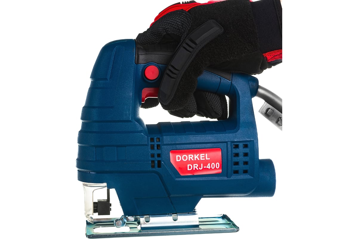 Лобзик DORKEL DRJ-400 снабжен двигателем мощностью 400 Вт. Удобно расположенная клавиша "Пуск" фиксируется в положении старт - для удобства выполнения больших пропилов. Для поддержания рабочего места в чистоте, инструмент имеет патрубок для отвода пыли, к которому можно подключить пылесос. Прозрачный защитный экран защищает оператора от крупных опилок и не заслоняет обзор линии распила.