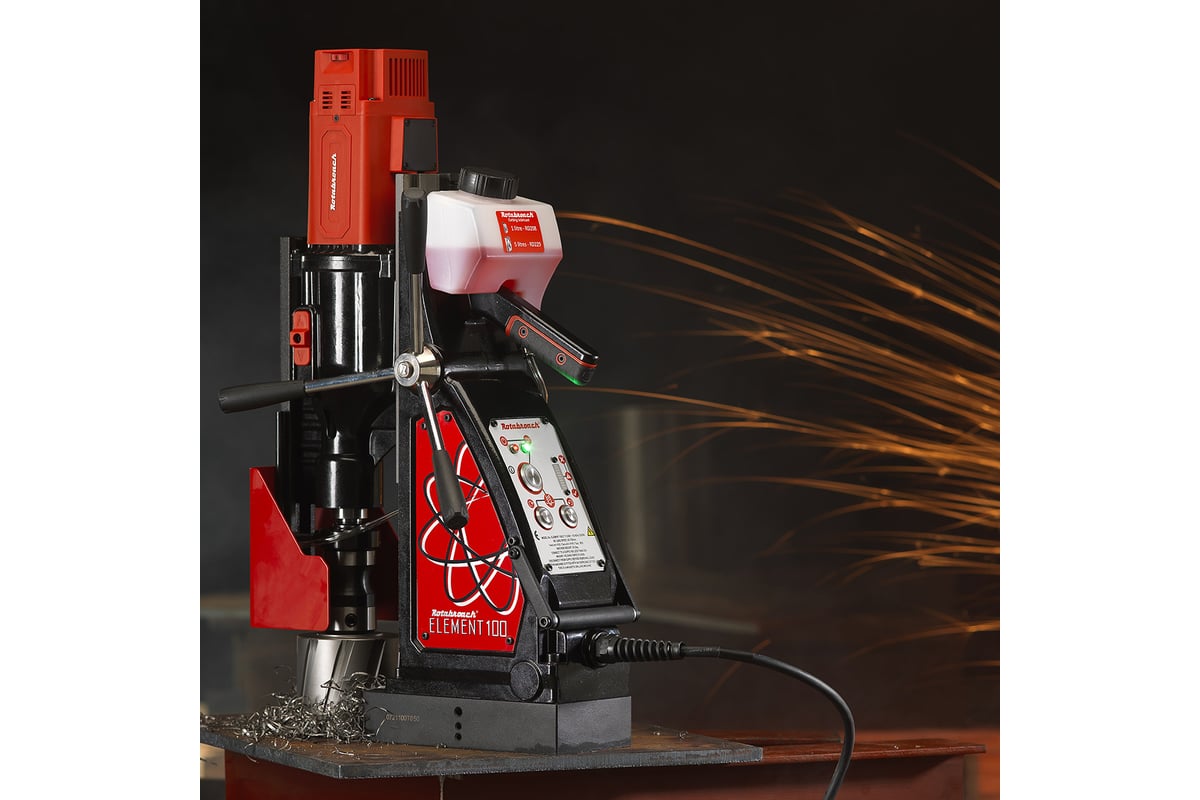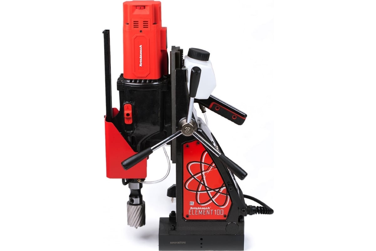 Магнитный электрический сверлильный станок Rotabroach ELEMENT 100 КБ008992 - современная модель для получения отверстий в черных металлах. Установка оснащается магнитным основанием для надежного удержания на поверхности во время сверления. Сила магнита составляет 2000 кг. Смазочно-охлаждающая жидкость позволяет снизить нагрузку на двигатель и и избежать поломки агрегата. Станок имеет небольшие размеры и подходит для работ в стесненных условиях. Устройство активно используется на производстве или в строительстве.