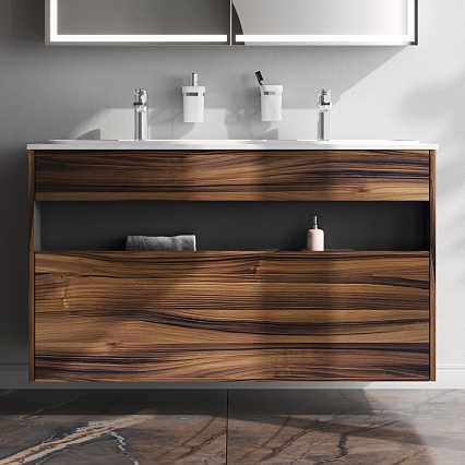 Удобный выдвижной ящик и вместительная открытая ниша позволяют хранить все необходимые средства под рукой. Невероятно мягкое открытие и закрытие благодаря направляющим скрытого монтажа с системой soft close. Универсальный монтаж подвесной и напольный (комплект ножек приобретается отдельно).