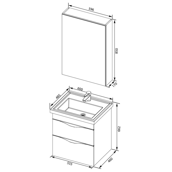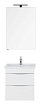 Подвесной комплект мебели включает в себя тумбу с вместительными выдвижными ящиками, зеркало-шкаф с внутренними отделениями и пенал, приобретаемый по желанию. Обратите внимание на нестандартную форму сияющих хромированных ручек. По традиции, все дверки закрываются легко и плавно, чему способствует механизм доводчика.