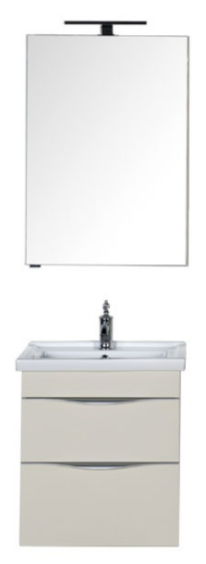 Подвесной комплект мебели включает в себя тумбу с вместительными выдвижными ящиками, зеркало-шкаф с внутренними отделениями и пенал, приобретаемый по желанию. Обратите внимание на нестандартную форму сияющих хромированных ручек. По традиции, все дверки закрываются легко и плавно, чему способствует механизм доводчика.