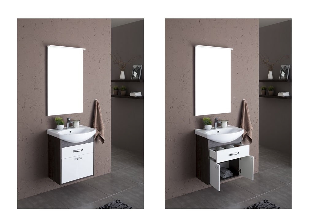 Комплект мебели Aquanet Грейс 60, цвет - дуб кантенбери/белый, выполнен в цветовом сочетании белого глянца с древесной фактурой «дуб кантенбери». Дуб кантенбери темного цвета создает контрастные сочетания с белым, в результате чего фасад, установленный по типу вкладного, в окружении торцевых частей корпуса смотрится словно в элегантной рамке. Внутреннее пространство тумбы шириной 60 см очень функционально: выдвижной ящик вверху с отделениями под мелочь и распашные дверцы внизу с аккуратными круглыми ручками. В комплекте с тумбой предусмотрена керамическая раковина «Элеганс» с обрамлением. Зеркало шириной 60 см с контрастными торцевыми деталями в цвете дуб кантенбери выглядит изысканно. Оно оснащено верхним козырьком из МДФ, в который встроен LED-светильник.
