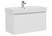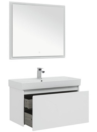 Мебель для ванной Aquanet Nova Lite 90 белоснежного цвета из влагостойкой ламинированной древесно-стружечной плиты выглядит нарядно. Подвесной монтаж придает визуальную легкость тумбе шириной 90 см. Тумба оборудована одним большим ящиком, внутри которого предусмотрен маленький с выемкой для установки сифона и разделителями, где удобно хранить необходимые в ванной комнате мелочи. Фасады выполнены с декоративной интегрированной ручкой, не имеющей острых краев и внутренних углов, что обеспечивает удобство в эксплуатации и легкий уход за мебелью. Ящики комплектуются направляющими немецкого производства Hettich Quadro, оснащенными доводчиками. Неглубокая и стильная керамическая раковина «Латина» идеально подходит к тумбе. Комплект дополняет зеркало с LED-подсветкой по периметру.
