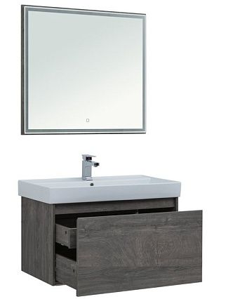 Мебель для ванной Aquanet Nova Lite 90 из влагостойкой ламинированной древесно-стружечной плиты в благородном цвете «дуб рошелье» имеет достойный вид. Фактура натурального дерева выглядит изысканно, а подвесной монтаж придает визуальную легкость тумбе шириной 90 см. Тумба оборудована одним большим ящиком, внутри которого предусмотрен маленький с выемкой для установки сифона и разделителями, где удобно хранить необходимые в ванной комнате мелочи. Фасады выполнены с декоративной интегрированной ручкой, не имеющей острых краев и внутренних углов, что обеспечивает удобство в эксплуатации и легкий уход за мебелью. Ящики комплектуются направляющими немецкого производства Hettich Quadro, оснащенными доводчиками. Неглубокая и стильная керамическая раковина «Латина» идеально подходит к тумбе. Комплект дополняет зеркало с LED-подсветкой по периметру.