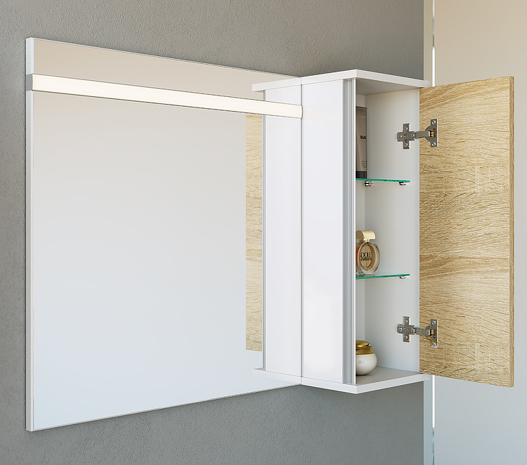 Зеркальная панель оснащена встроенной светодиодной подсветкой с сенсорным выключателем. Зеркало может крепиться как с вертикальным положением подсветки, так и горизонтальным. Таким образом подсветка может находиться сбоку или сверху. Шкафчик с дверью на петлях с доводчиком может быть установлен слева или справа относительно зеркальной панели.
