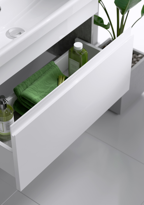 Размеры мебели позволяют применять ее даже в малогабаритных ванных комнатах. Подвесные гарнитуры с вместительным ящиком на направляющих австрийской фирмы Blum с системой мягкого закрывания (на которые производитель дает вечную гарантию). Предметы коллекции оснащены итальянскими навесами Camar, которые выдерживают нагрузку до 200 кг. Корпус мебели из ЛДСП (древесностружечной плиты повышенной плотности) в двух цветах: дуб балтийский и бетон светлый. Фасады выполнены из МДФ (древесно-волокнистой плиты повышенной плотности) и покрыты 5-ю слоями белой глянцевой эмали. Интегрированные ручки выполнены фрезеровкой фасада, а толщина материала 22 мм обеспечивает более удобный захват при открытии по сравнению с аналогами. Цвет донышка ящиков совпадает с цветом боковин. Коллекция комплектуется керамическими умывальниками серии Moduo Slim польского производителя Cersanit. Завершить меблировку ванной комнаты можно с помощью зеркал RM (круглые) или SM (с подсветкой), а для увеличения места хранения можно применить зеркальные шкафы MC.Технические характеристики