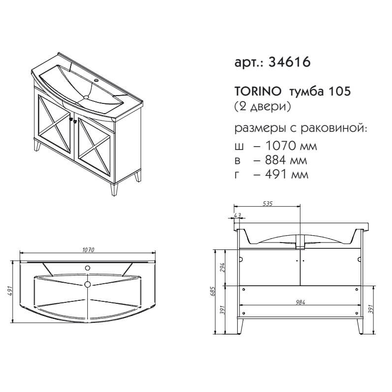 Мебель для ванной Caprigo Torino 105 см с 2 дверцами в цвете оливин.