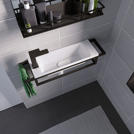 Одноярусный подвесной сварной каркас выполнен из металлических профилей и покрыт черной порошковой краской, что придает консоли брутальности и невесомости одновременно. Консоль оснащена полотенцедержателем с правой стороны. Подвесы для крепления тумбы - в комплекте.