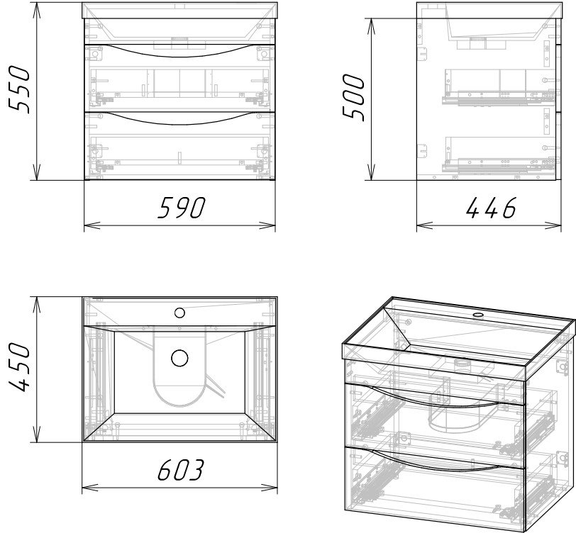 Тумба подвесная Талис-60 имеет два вместительных выдвижных ящика с врезными ручками в плоскости фасада.