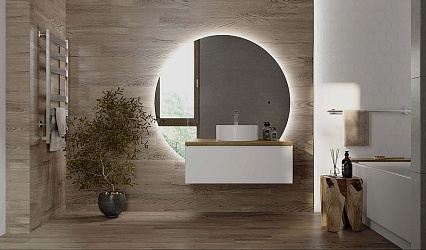 Вариативность комплектации зеркала позволяет адаптировать коллекцию по ширине, функционалу и визуальному богатству образа. Большое круглое зеркало с подсветкой по периметру, напоминающее солнечный диск, увеличивает пространство ванной комнаты, смягчает его и придает гармонию интерьеру ванной комнаты. Светодиодная подсветка зеркала оснащена бесконтактным выключателем. Пенал, встроенный в зеркало, имеет дополнительную вертикальную подсветку.